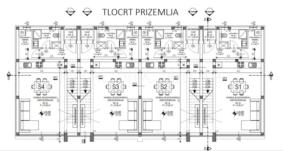 S4 - u prizemlju se nalazi natkriveni ulaz, hodnik, kupaonica, vešeraj, kuhinja, blagovaonica i dnevni boravak sa izlazom na VRT (95,00 m2). Na katu kuće smještene su tri spavaće sobe i kupaonica. U dvorištu kuće nalaze se dva vanjska parkirna mjesta. Cijena: 380.568,00 EUR-a.