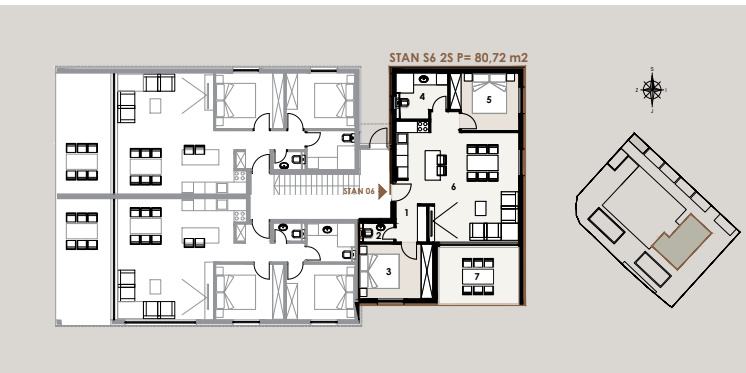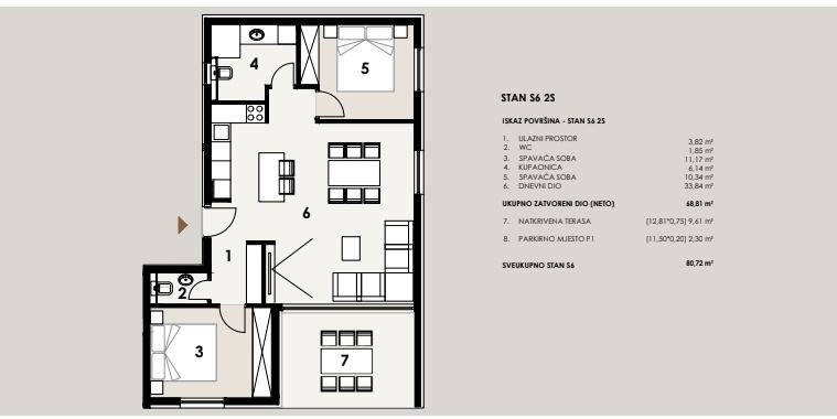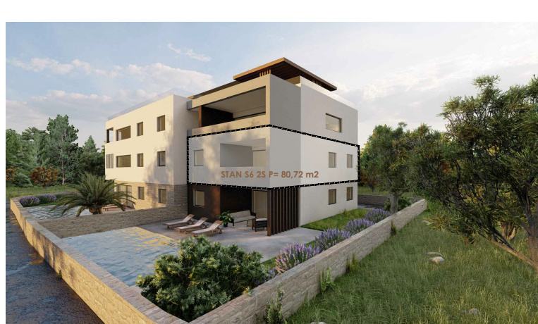 NOVOGRADNJA – Stan S6 na 1. katu zgrade ,samo 60 m od pješčane plaže . Prodaje se stan na 1. katu novogradnje sa 8 stanova, smještenoj u mirnom dijelu Privlake. Zgrada je u gradnji, a useljenje se planira u svibnju 2026. Stan oznake S6 se sastoji od ulaznog prostora, kuhinje s blagavaonom i dnevnim boravkom, dvije spavaće sobe, kupaone i wc-a, ukupno 68,81 m2 stambeno, plus natkrivena terasa 12,81 m2 po koef 0,75 9,61 m2) i jedno parkirno mjesto. Ukupno stan oznake S6 sa pripatcima ima 80,72 m2. • Vrhunska unutarnja stolarija • PVC stolarija s ALU roletama na elektro pogon, troslojno staklo s Low-e premazom, komarnici • Podovi: parket i keramika I. klase Dodatne pogodnosti: • Visok energetski standard (A razred) • Kupac ne plaća porez na promet nekretnina • Cijena: 340 000 EUR . U zgradi su na prodaju sljedeći stanovi: S1 - prizemlje, dvosoban stan sa vrtom 85,35 m² – 345.000,00 € S2 - prizemlje, dvosoban stan sa vrtom i bazenom 108,55 m² , kompletno namješten 545 000 eura. S3 – prizemlje, dvosoban stan sa vrtom i bazenom 97,87 m² - kompletno namješten 490.000 € . S4 - 1. kat, dvosoban stan 80,75 m² – 325.000,00 € S5 - 1. kat, dvosoban stan 80,70 m² – 365.000,00 € S6 – 1. kat, dvosoban stan 80,72 m² – 340.000,00 € S7 – 2. kat trosoban stan sa krovnom terasom 158,33 m² – 760.000,00 € (namješten). S8 - 2. kat, trosoban stan sa krovnom terasom 157,69 m² – 720.000,00 € (namješten). Četiri stana će biti kompletno namještena stanovi S2 i S3 u prizemlju i stanovi S7 i S8 na 2 katu . U cijenu je uključen namještaj, ostali se prodaju nenamješteni. Zgrada je u gradnji te se planira završetak do sezone 2026. godine.