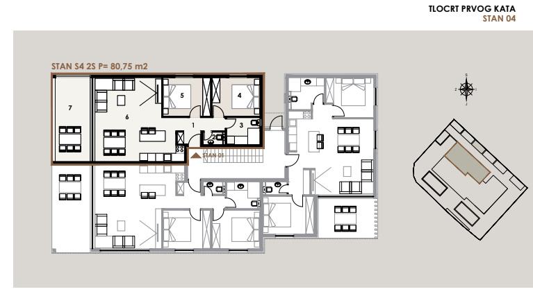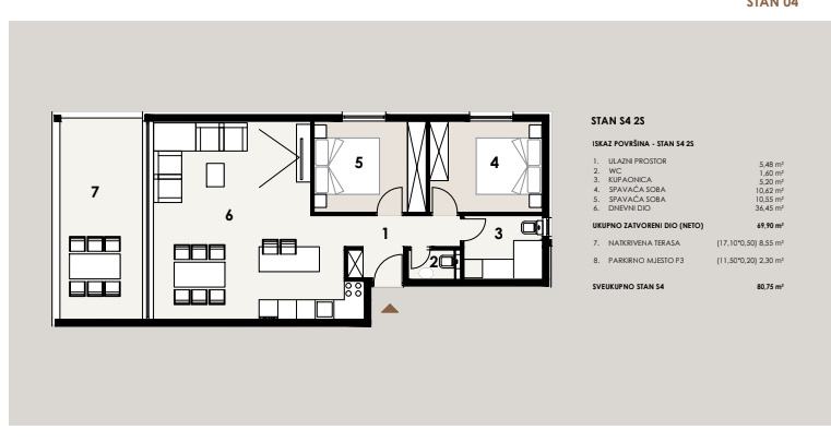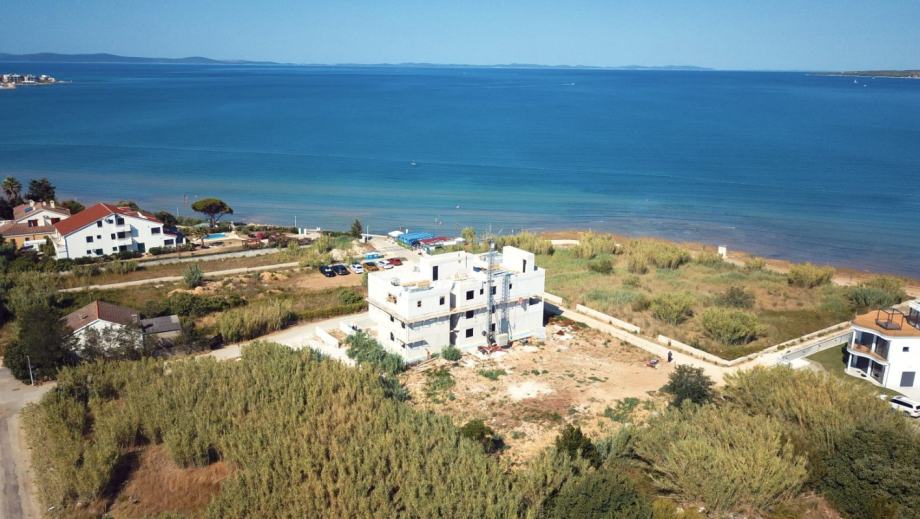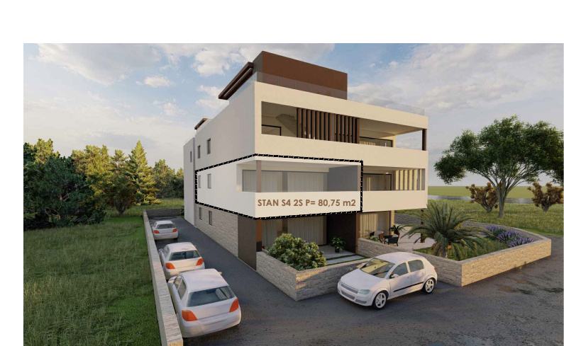 NOVOGRADNJA – Stan S4 na 1. katu zgrade ,samo 60 m od pješčane plaže . Prodaje se stan na 1. katu novogradnje sa 8 stanova, smještenoj u mirnom dijelu Privlake. Zgrada je u gradnji, a useljenje se planira u svibnju 2026. Stan oznake S4 se sastoji od ulaznog prostora, kuhinje s blagavaonom i dnevnim boravkom, dvije spavaće sobe, kupaone i wc-a, ukupno 69,90 m2 stambeno, plus natkrivena terasa 17,10 m2 po koef 0,5 8,55 m2) i jedno parkirno mjesto. Ukupno stan oznake S4 sa pripatcima ima 80,75 m2. • Vrhunska unutarnja stolarija • PVC stolarija s ALU roletama na elektro pogon, troslojno staklo s Low-e premazom, komarnici • Podovi: parket i keramika I. klase Dodatne pogodnosti: • Visok energetski standard (A razred) • Kupac ne plaća porez na promet nekretnina • Cijena: 325 000 EUR . U zgradi su na prodaju sljedeći stanovi: S1 - prizemlje, dvosoban stan sa vrtom 85,35 m² – 345.000,00 € S2 - prizemlje, dvosoban stan sa vrtom i bazenom 108,55 m² , kompletno namješten 545 000 eura. S3 – prizemlje, dvosoban stan sa vrtom i bazenom 97,87 m² - kompletno namješten 490.000 € . S4 - 1. kat, dvosoban stan 80,75 m² – 325.000,00 € S5 - 1. kat, dvosoban stan 80,70 m² – 365.000,00 € S6 – 1. kat, dvosoban stan 80,72 m² – 340.000,00 € S7 – 2. kat trosoban stan sa krovnom terasom 158,33 m² – 760.000,00 € (namješten). S8 - 2. kat, trosoban stan sa krovnom terasom 157,69 m² – 720.000,00 € (namješten). Četiri stana će biti kompletno namještena stanovi S2 i S3 u prizemlju i stanovi S7 i S8 na 2 katu . U cijenu je uključen namještaj, ostali se prodaju nenamješteni. Zgrada je u gradnji te se planira završetak do sezone 2026. godine.