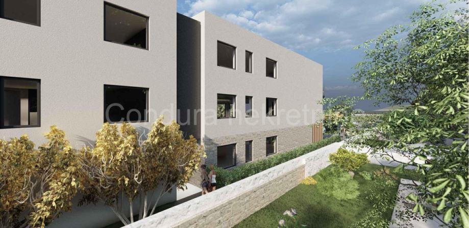 Iz dnevnog boravka se kroz staklene stijene izlazi na natkrivenu terasu površine 15,15 m2 na koju se nastavlja vrt površine 50,15 m2 te popločan dio vrta površine 22,20 m2.