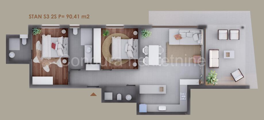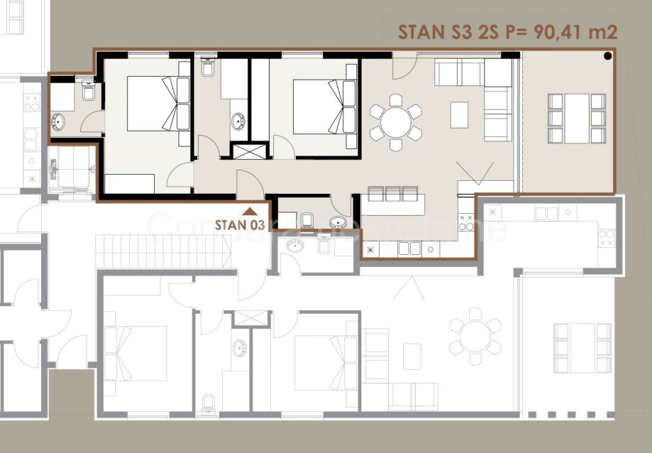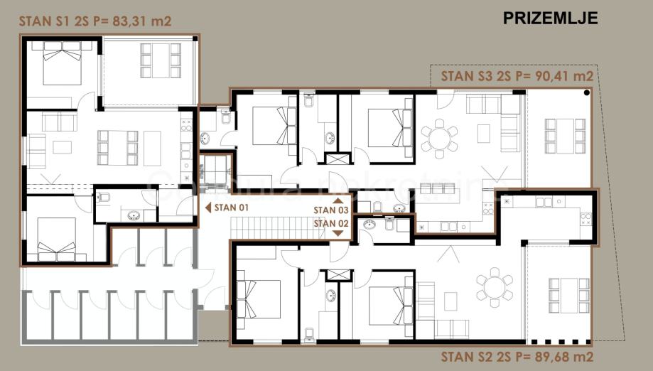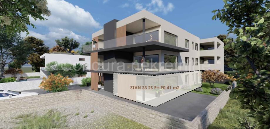 - stan S3 neto površine s pripadcima 90,41 m2 koji se sastoji od: dnevnog boravka s blagovaonicom i kuhinjom, 2 spavaće sobe, kupaonice, toaleta, hodnika i natkrivene terase. Pripada mu spremište površine 2,20 m2, popločan dio vrta 11,80 m2 te jedno parkirno mjesto u dvorištu zgrade.