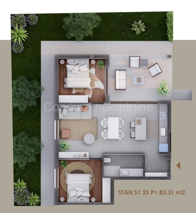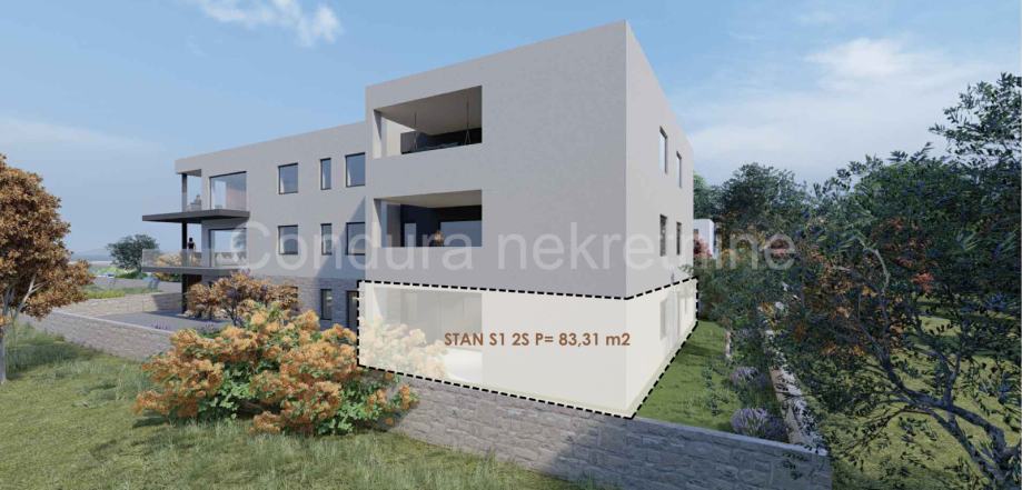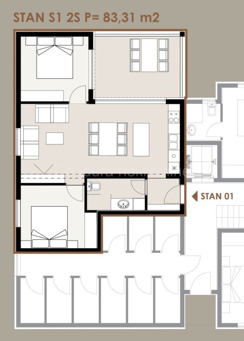 Ukupna neto površina stana s pripadcima iznosi 83,31 m2, a na priloženom tlocrtu označen je kao S1.