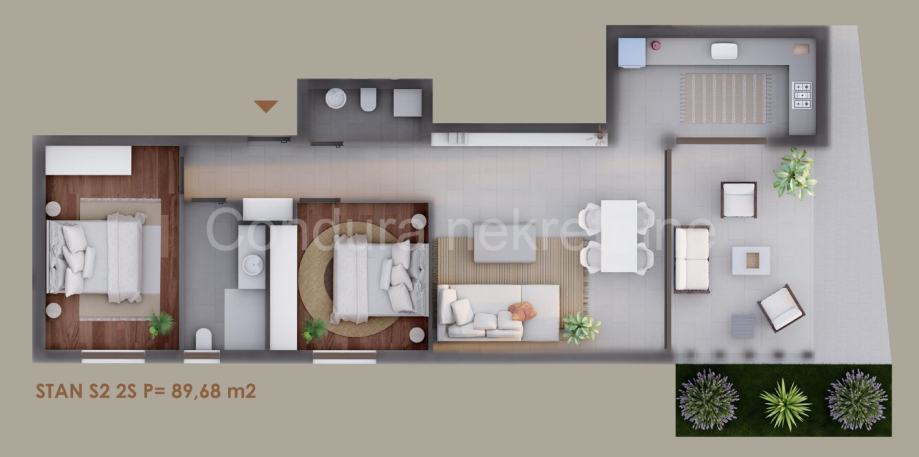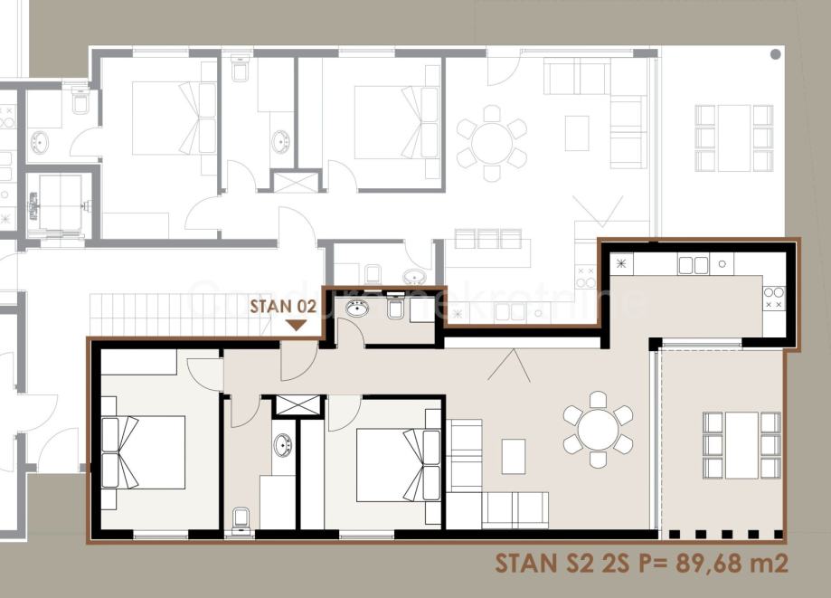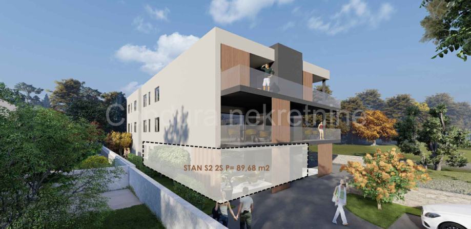 - stan S2 neto površine s pripadcima 89,68 m2 koji se sastoji od: dnevnog boravka s blagovaonicom i kuhinjom, 2 spavaće sobe, kupaonice, toaleta, hodnika i natkrivene terase. Pripada mu spremište površine 2,10 m2, vrt površine 8,00 m2, popločan dio vrta 7,90 m2 te jedno parkirno mjesto u dvorištu zgrade.
