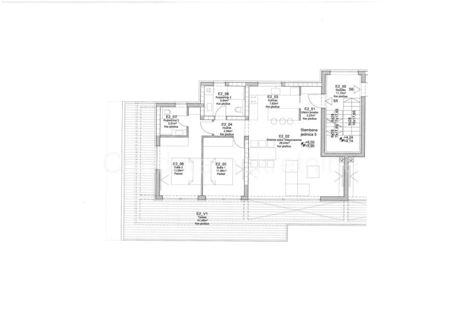 Apartman S5 ima površinu 121,25 m2 a sastoji se od dvije spavaće sobe, dvije kupaonice, hodnika, kuhinje sa blagavaonom i velikim dnevnim boravakom te prostrane djelomično natkrivene terase. Pripada mu i krovna terasa (76,86 m2) na kojoj će biti priprema za jacuzzi te ljetnu kuhinju. Cijena: 547.000,00 EUR