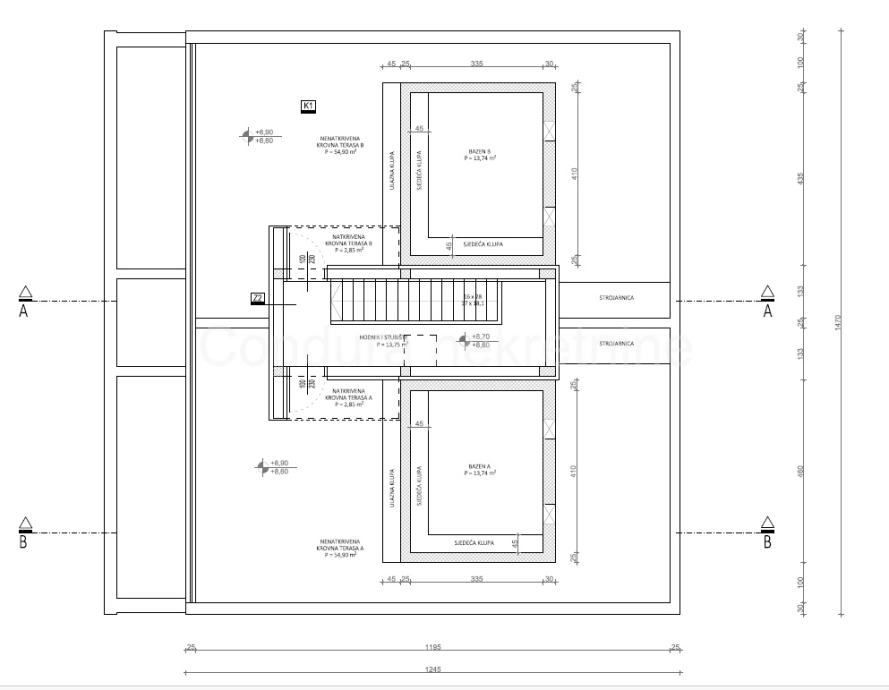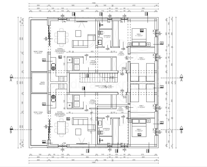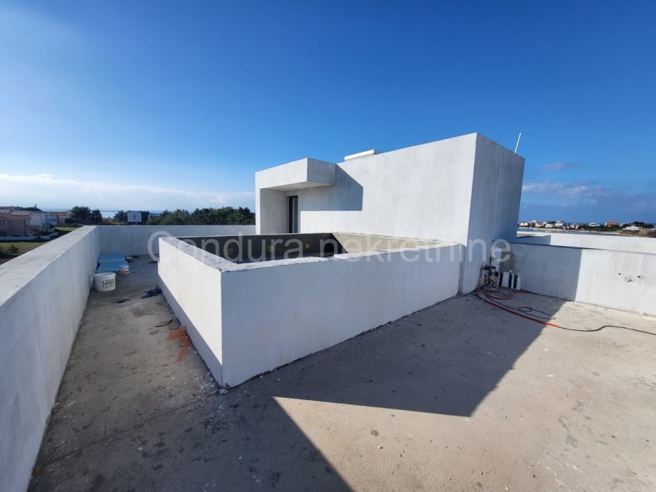 Stan S5 (90,71 m2) – ulaz i hodnik, kuhinja s blagovaonicom, vešeraj i spremište, kupaonica, dvije spavaće sobe, nenatkrivena terasa (10,70 m2), 2 PM te prostrana krova terasa 57.75 m2 s bazenom (13,74 m2) i panoramskim pogledom na more i planinu Velebit – 450.000 EUR