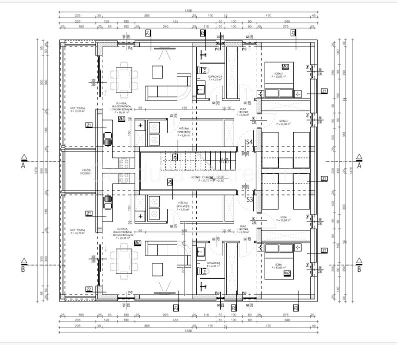 Stan S1 (67,18 m2) – ulaz, kuhinja s blagovaonicom, predsoblje, vešeraj i spremište, kupaonica, spavača soba, natkrivena terasa (12,80 m2), 2 PM i vrt (65 m2) – 240.000 EUR