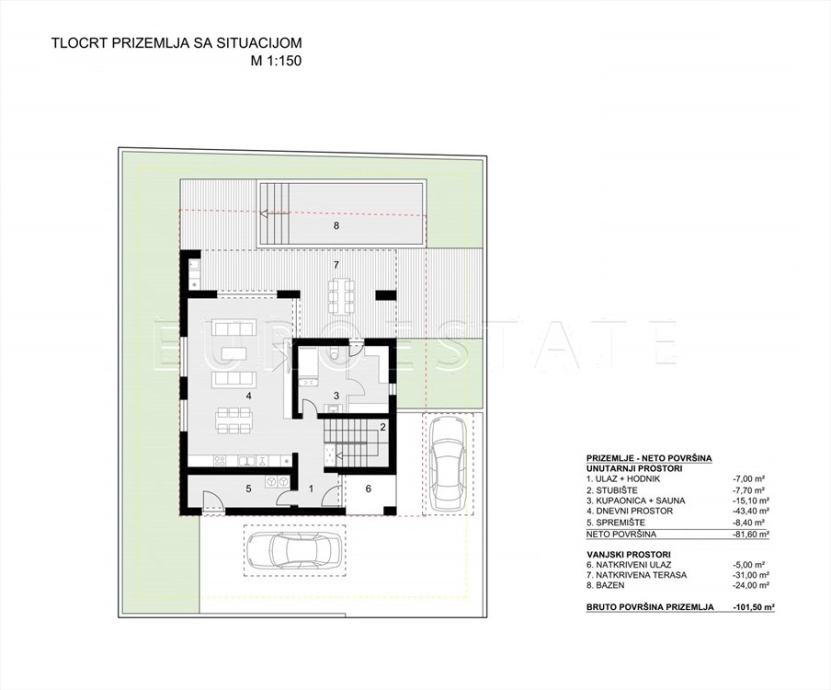 PRIZEMLJE: natkriveni ulaz, ulazni hodnik, spremište / praonica rublja, kupaonica sa wc-om i saunom, kuhinja / blagovaona / dnevni boravak, natkrivena terasa, bazen sa sunčalištem