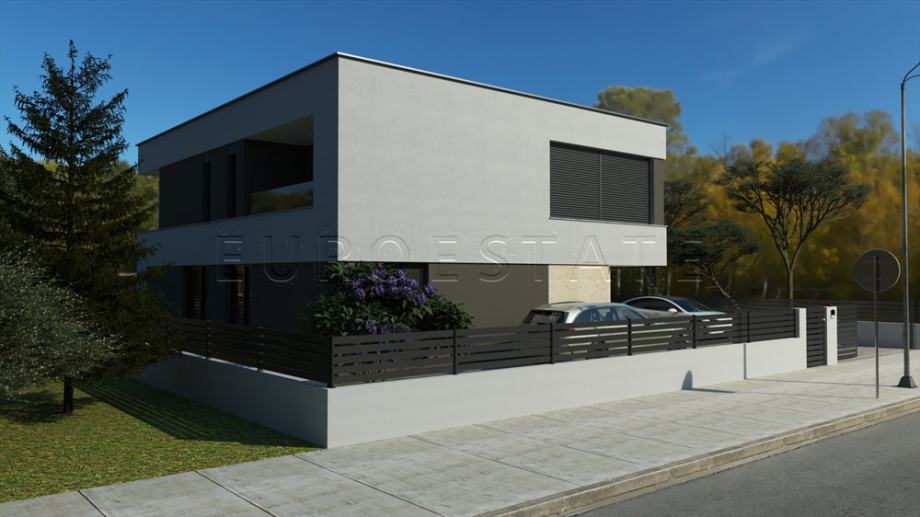 - kuća je moderne arhitekture sa prostranom terasom u prizemlju i lođama staklenim ogradama na katu,