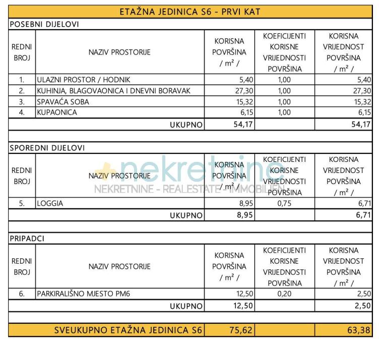 Prostran stan oznake S6 se nalazi na 1.katu, i površine je 63 m2, koji se sastoji od prostrane spavaće sobe, kupaone, open space dnevnog boravka sa blagavaonom i kuhinjom, te izlazom na veliku loggiu površine 8.95 m2.