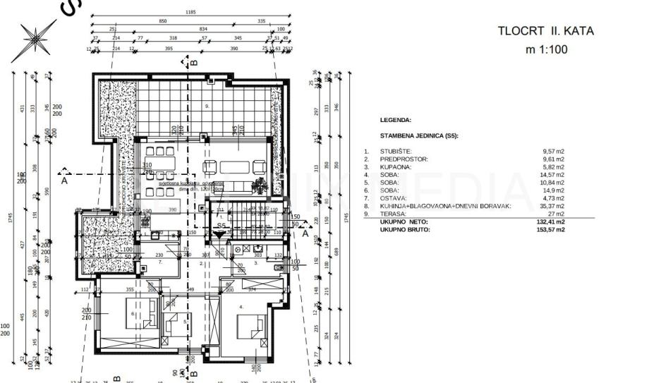 Penthouse oznake S5 nalazi se na cijelom drugom katu. Iz stana se pruža POGLED NA MORE! Penthouse neto korisne površine 102,38 m2 koji se sastoji od kuhinje, blagovaonice i dnevnog boravka sa izlazom na prostranu terasu, predsoblja, tri spavaće sobe, jedne kupaonice te ostave.