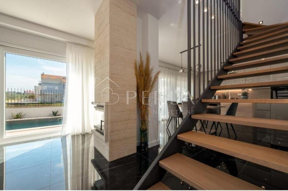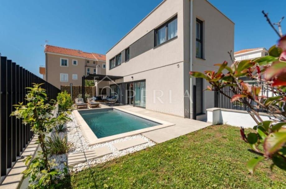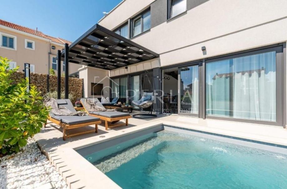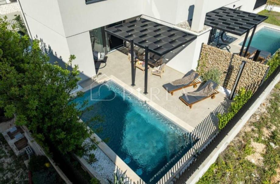 PRIVLAKA, prodaje se dvojna kuća modernog dizajna s bazenom, na samo 60 m udaljenosti od mora.