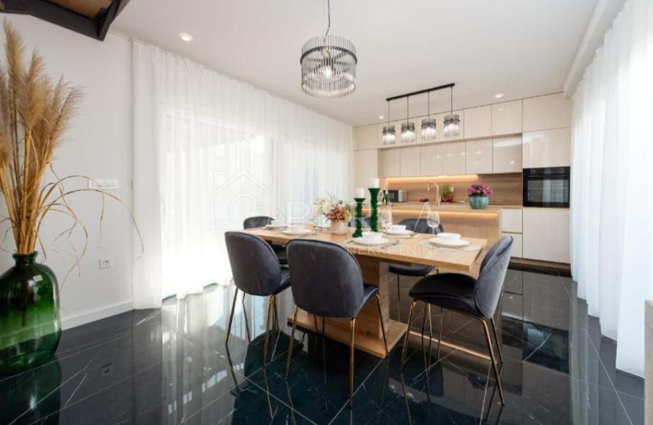 U prizemlju se nalazi ulazni prostor, stubište, kupaonica, dnevni prostor; kuhinja + blagovaonica + dnevni boravak sa staklenim stijenama i izlazom na prostranu terasu.