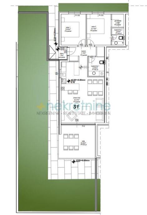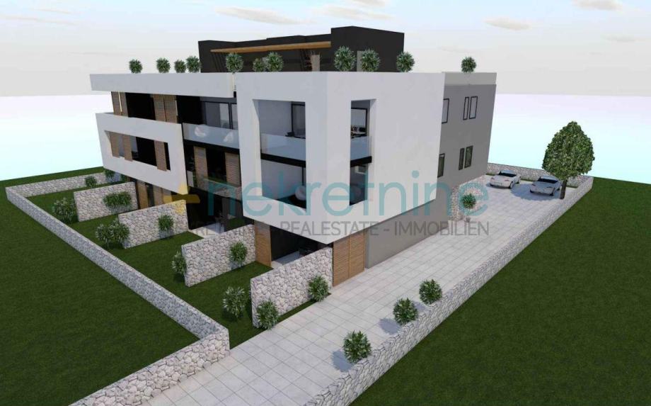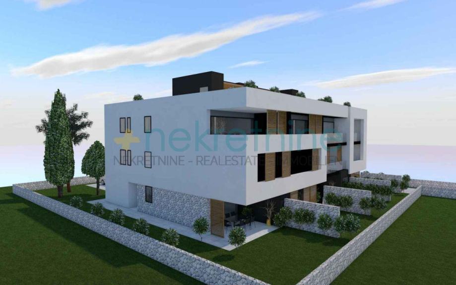 Prodaje se prostrani dvosobni stan (S1) u prizemlju novogradnje u Privlaci, u neposrednoj blizini Zadra. Ukupna površina stana s pripadcima iznosi 100,09 m².