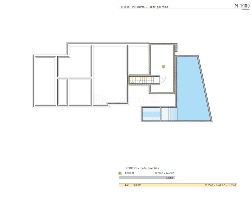 Kuća raspolaže i podrumom površine 18,28 m², namijenjenim smještaju bazenske tehnike, s pristupom putem vanjskih stepenica na jugoistočnoj terasi.