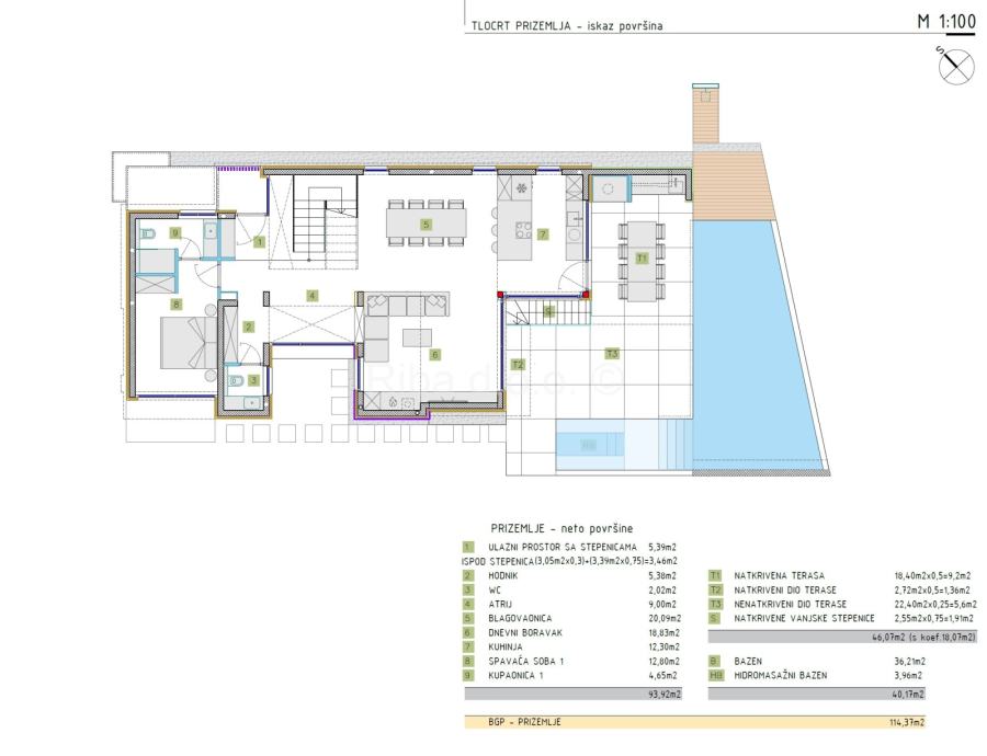 Dnevni boravak s kuhinjom i blagovaonicom ukupne površine 51 m² osmišljen je kao centralno mjesto okupljanja – prozračan, svijetao i povezan s vanjskim prostorima. Iz dnevnog boravka izlazi se na nenatkrivenu terasu – sunčalište, na kojoj je smješten bazen, dok se iz kuhinje izlazi na natkrivenu terasu s vanjskom kuhinjom i roštiljem, idealnu za objedovanje na otvorenom.