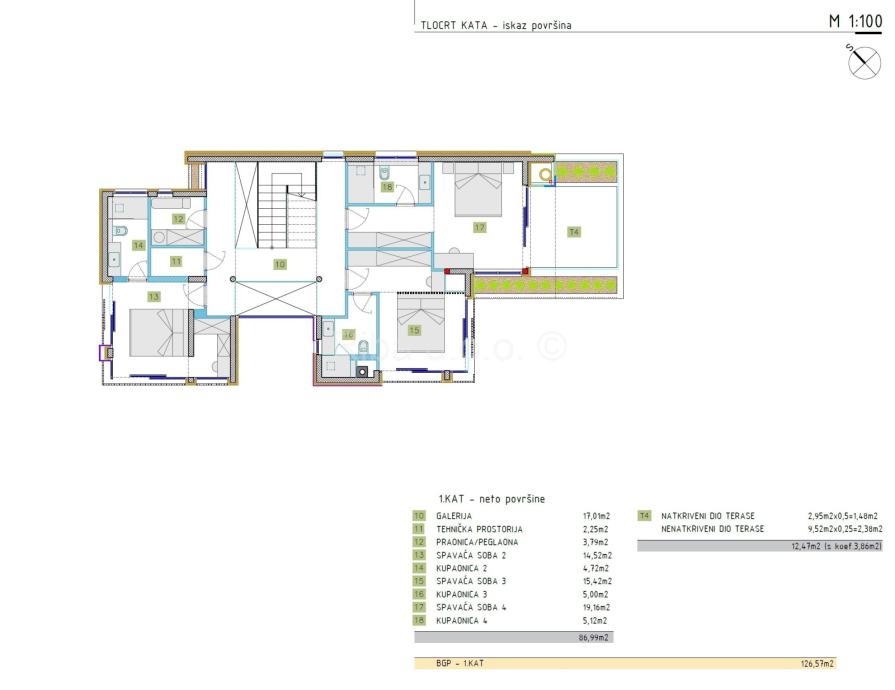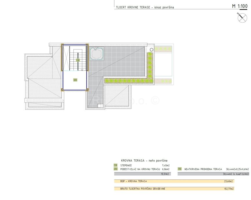 Iznad kata nalazi se krovna terasa površine 38 m², oplemenjena širokim žardinijerama. Predviđene su instalacije za moguću ugradnju jacuzzija, čime se dodatno podiže razina luksuza i uživanja, uz mogućnost opuštanja i uživanja u pogledu na more.