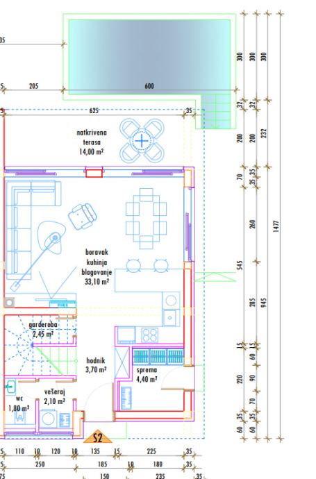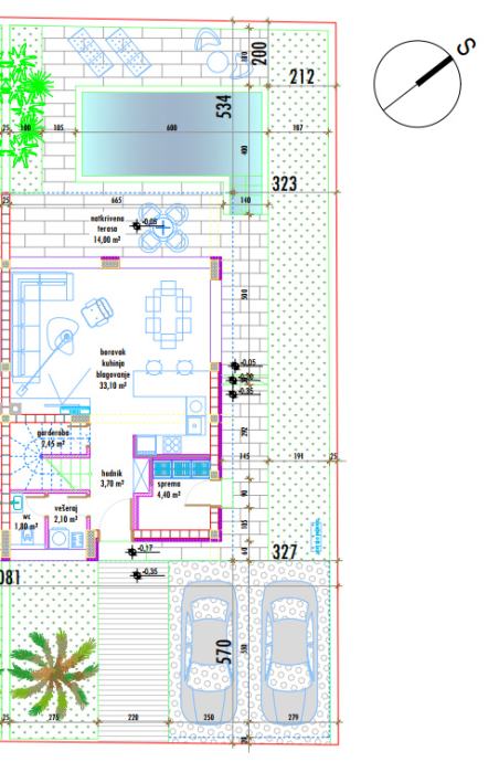Prizemlje: prostran dnevni boravak s kuhinjom i blagovaonicom otvorenog koncepta, garderoba, vešeraj, toalet, hodnik i ostava. Velike staklene stijene povezuju interijer s natkrivenom terasom i dvorištem u kojem se nalazi bazen.