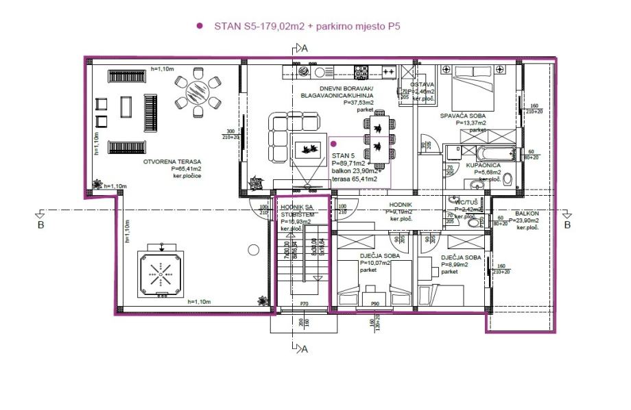 Na prodaju je četverosobni stan oznake S5 koji se nalazi na drugom katu stambene zgrade čiji je završetak gradnje planiran u travnju 2024.godine. Stambena zgrada se sastoji od pet stambenih jedinica koje su projektirane kako bi zadovoljile visoke standarde života. Na svakom katu zgrade se nalaze dvije stambene jedinice. Vrhunska kvaliteta zgradnje i opreme vidljiva je od samog početka gradnje. Vanjski izgled zgrade čini moderna arhitektura s velikim staklenim stijenama - PVC stolarija antracit boje, toplinska izolacija (10 cm stiropor), niskotemperaturni sustav podnog grijanja (dizalice topline) u svim stanovima, "walk - in" tuševi s kanalicom u razini poda, staklene kabine, sanitarije visoke klase, keramika i višeslojni parketi I klase.