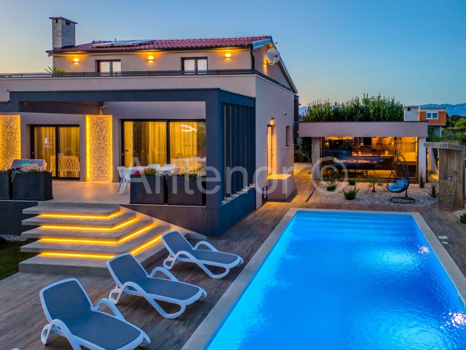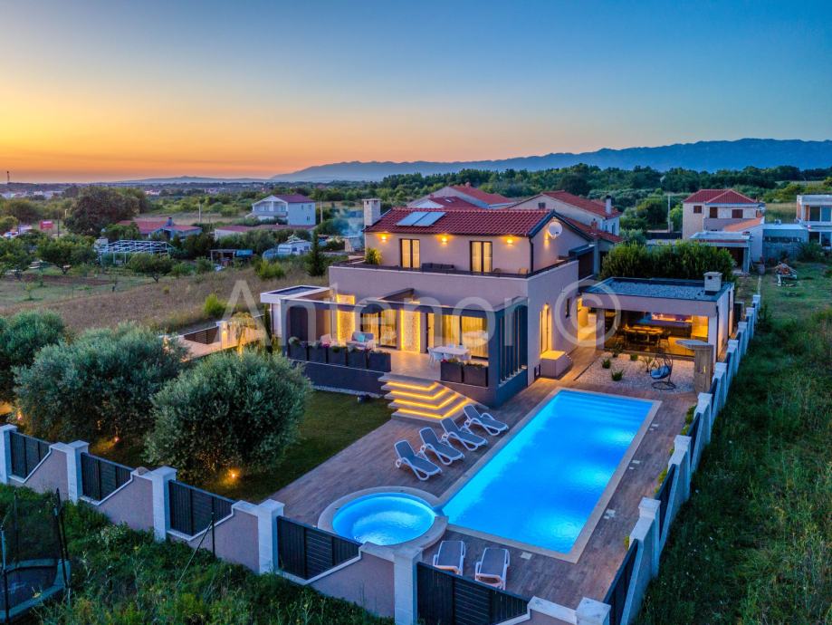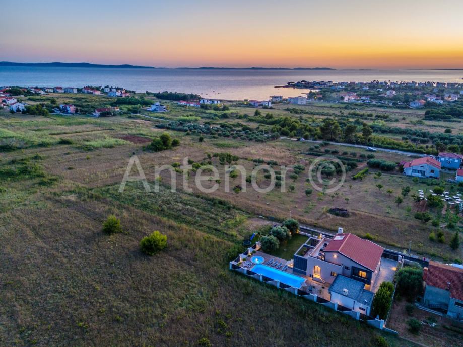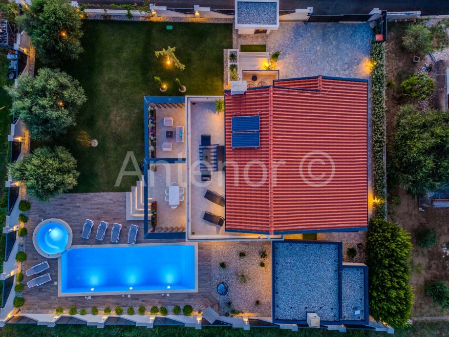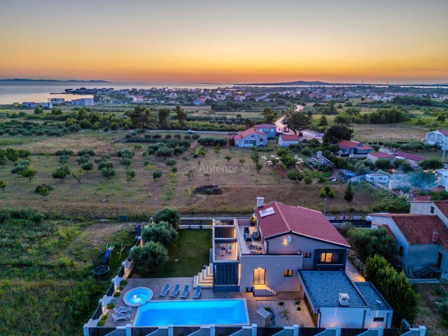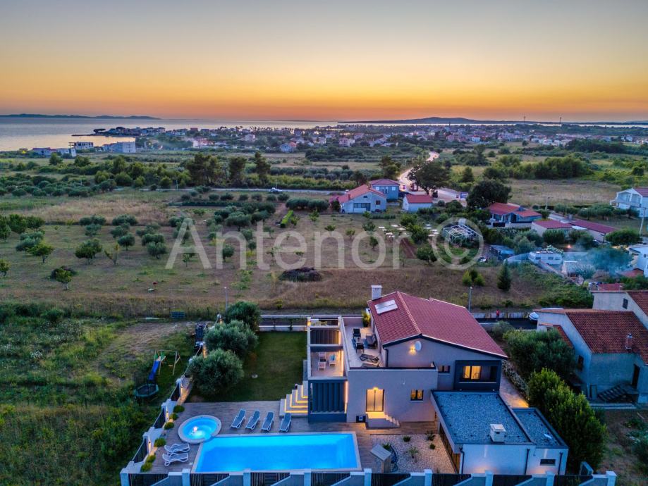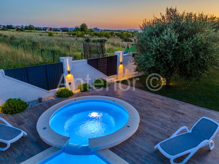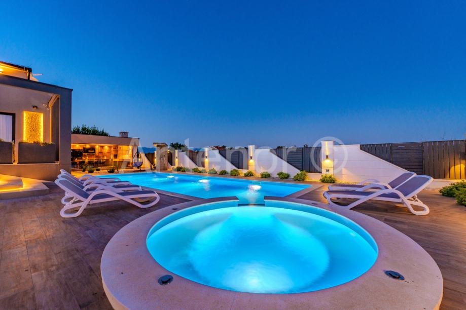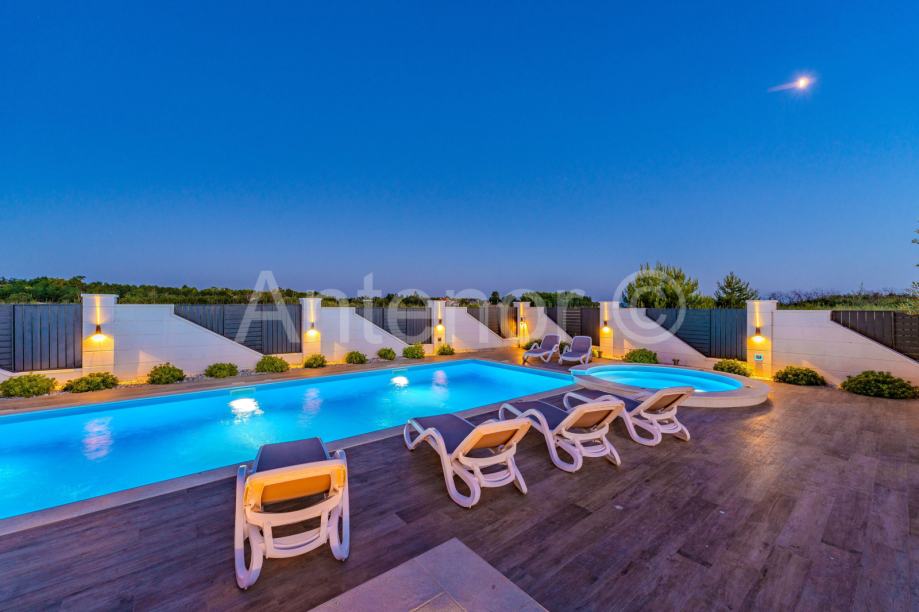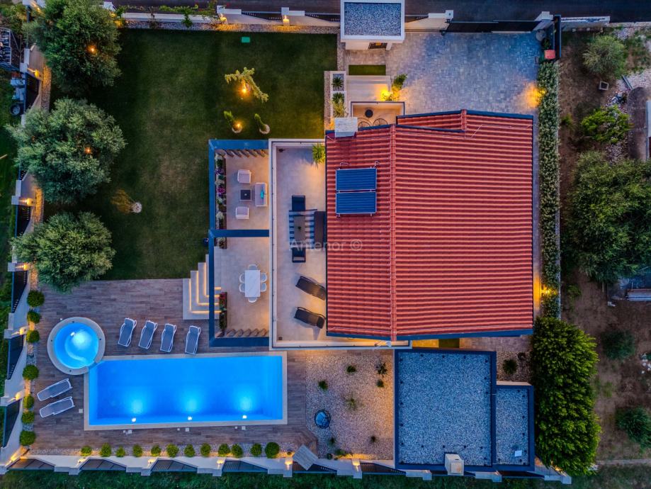 PRIVLAKA - kompletno namještena kuća sa bazenom i prekrasno uređenom okućnicom. Kuća se nalazi u mirnom dijelu mjesta te ima pogled na more, a udaljenost od mora je svega 800 m.