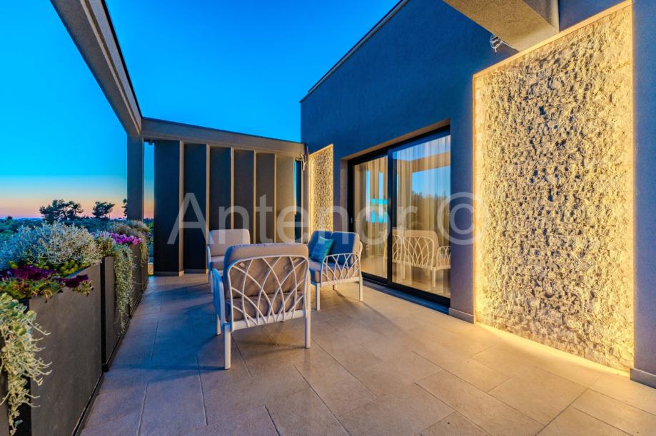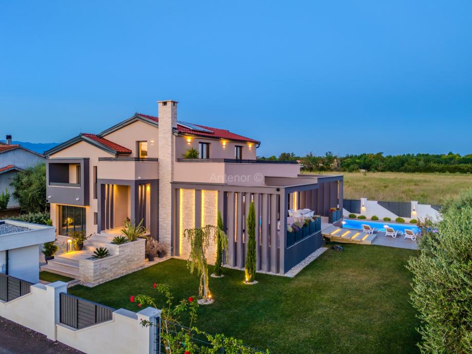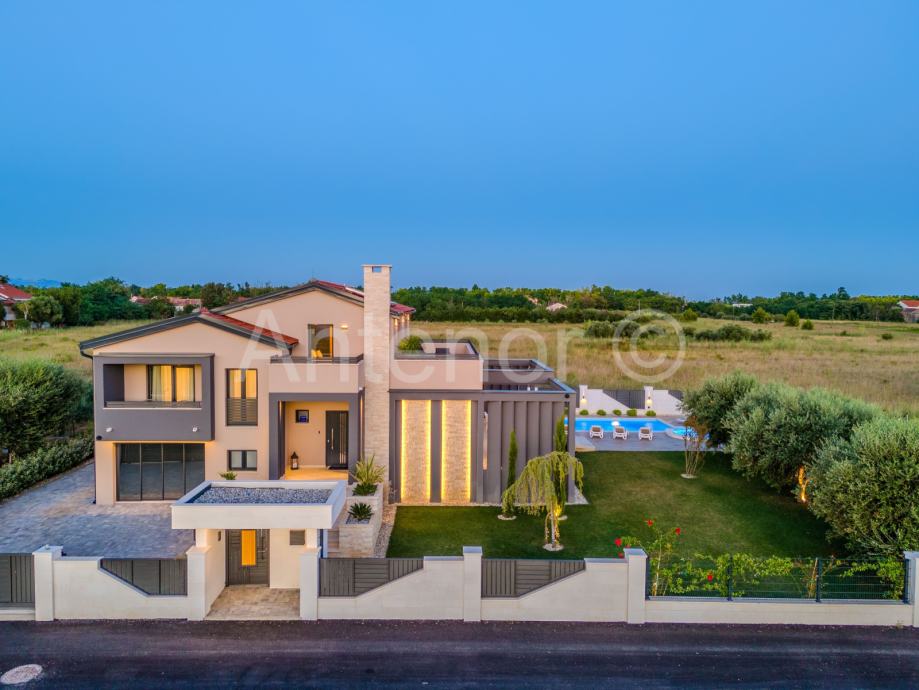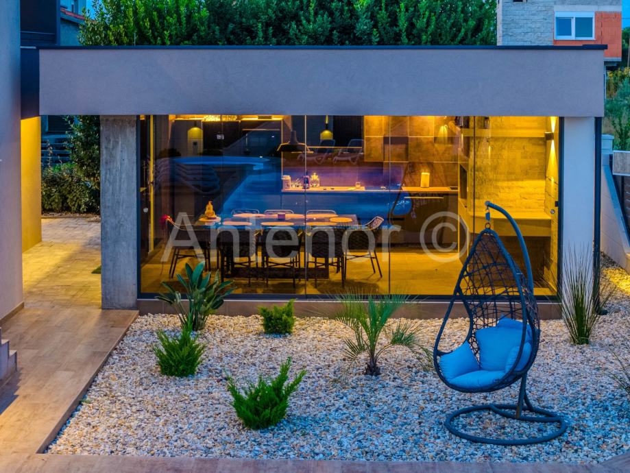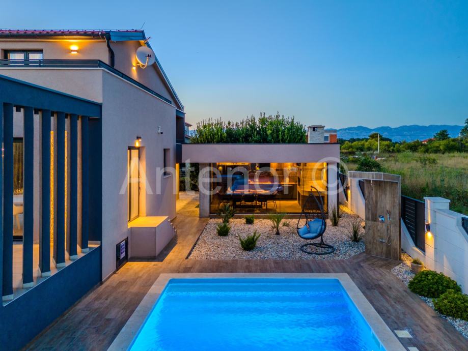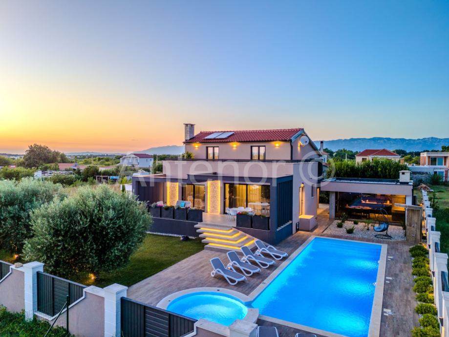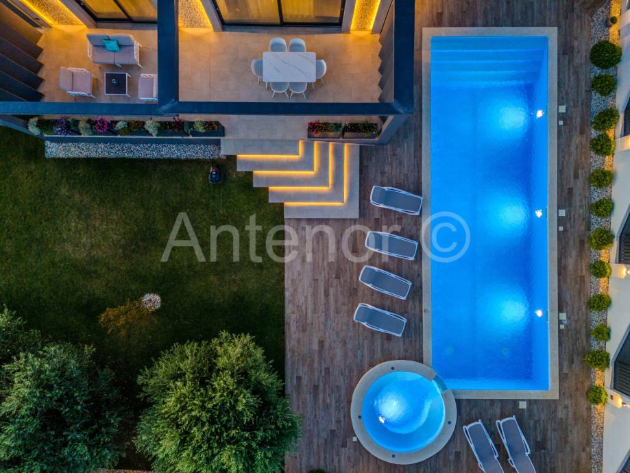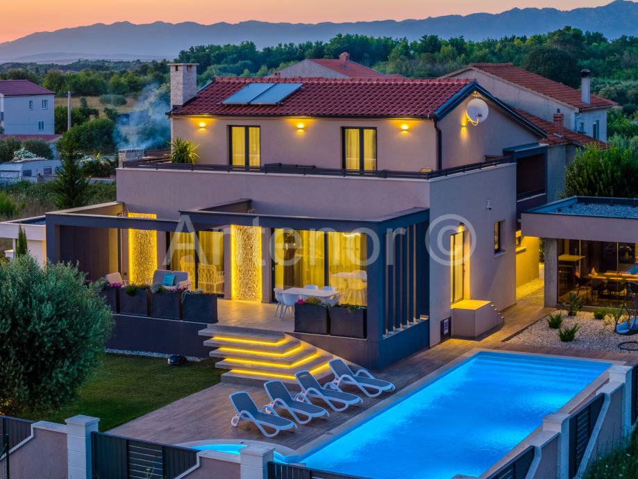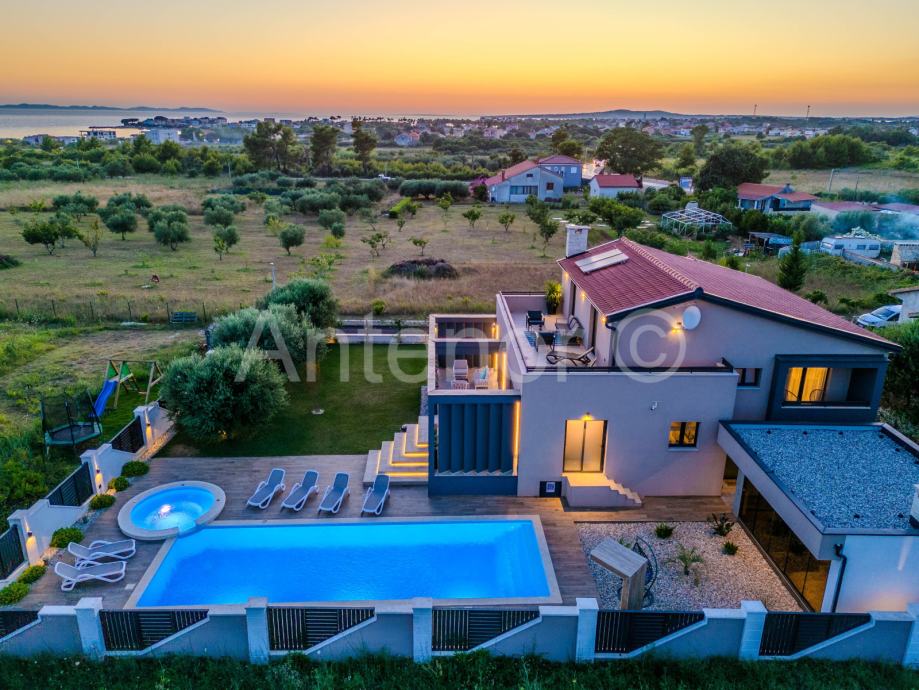 PRIVLAKA - kompletno namještena kuća sa bazenom i prekrasno uređenom okućnicom. Kuća se nalazi u mirnom dijelu mjesta te ima pogled na more, a udaljenost od mora je svega 800 m.