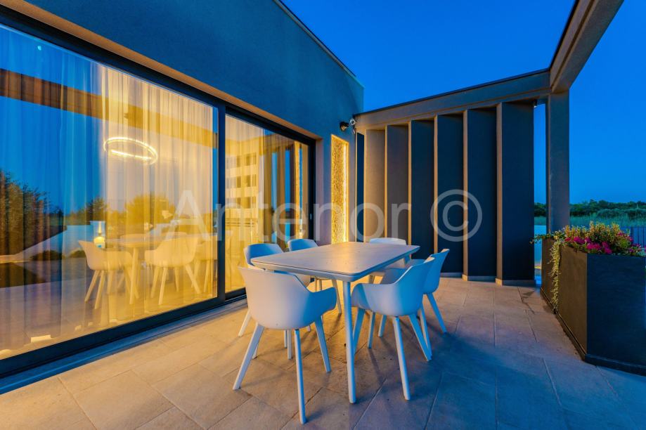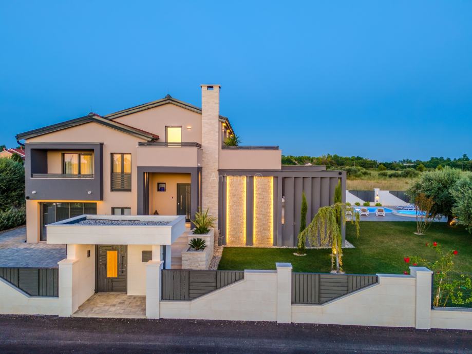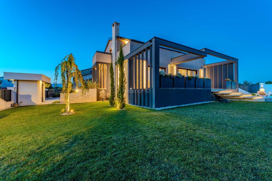 Kuća se sastoji od prizemlja i kata. U prizemlju se nalazi ulaz, hodnik, kupaonica, spremište, kuhinja, dnevni boravak i blagavaona, te još dvije dodatne prostorije: fitness i teretana, te igraonica gdje se nalazi tv, ps itd. U dnevnom dijelu kuće je velika staklena stijena pa se pruža osvijetljenje tijekom cijelog dana, te spaja unutarnji dio kuće sa dvorištem, sunčalištem i bazenom. Unutarnjim stubištem dolazi se na kat gdje se nalazi hodnik, 5 spavaćih soba, 4 kupaonice, 2 loggie i terasa.