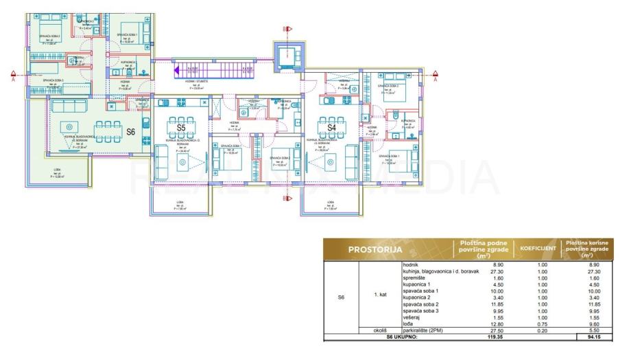 Predmetni stan oznake S6 nalazi se na prvom katu zgrade te se sastoji od kuhinje, blagovaonice i dnevnog boravka sa izlazom na loggiu, hodnika, tri spavaće sobe, dvije kupaonice, vešeraja i spremišta. Stanu pripadaju dva vanjska parkirna mjesta.