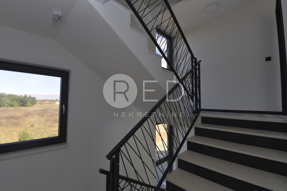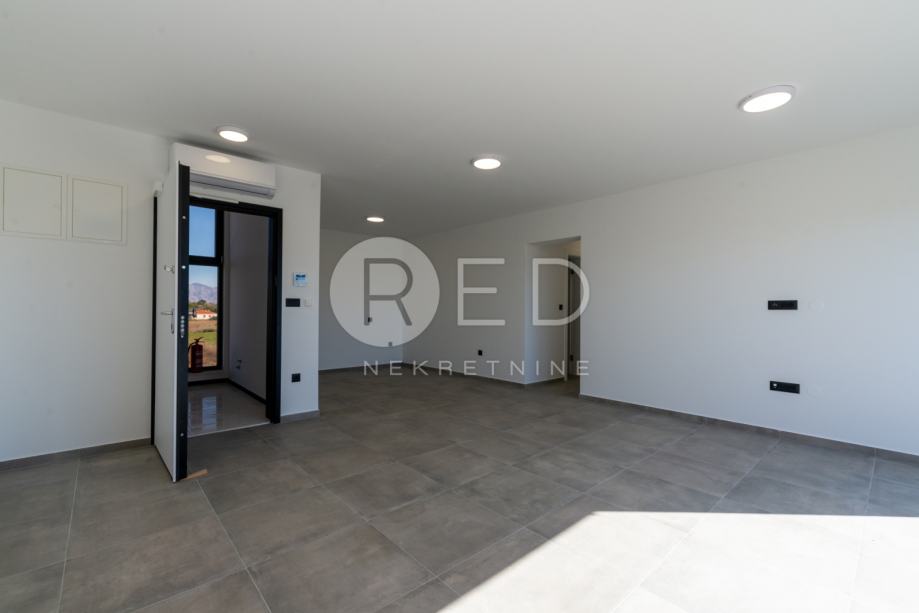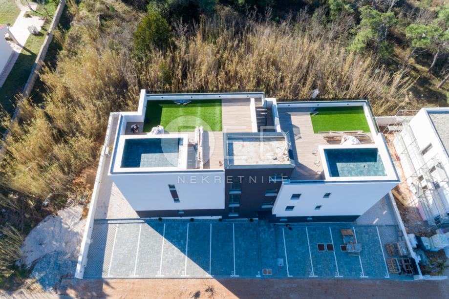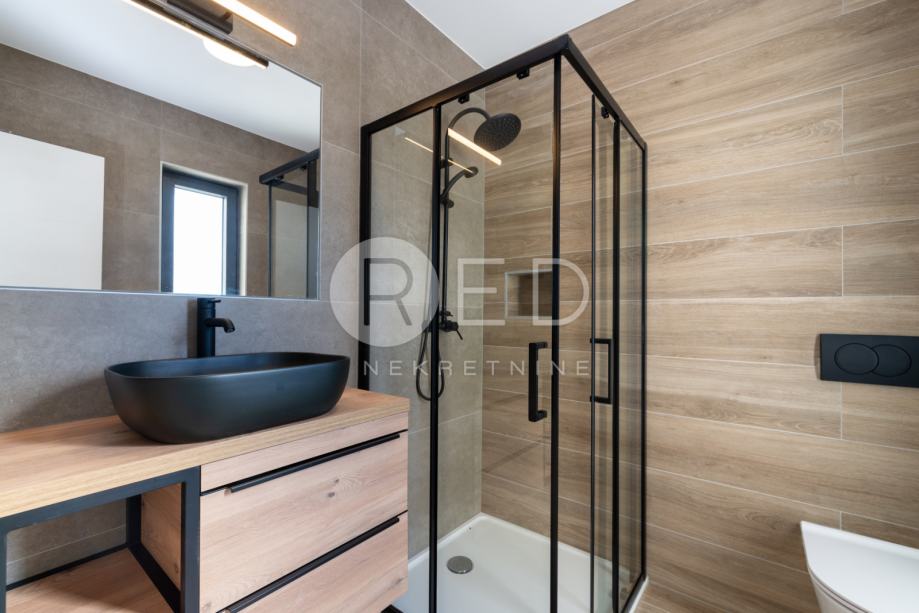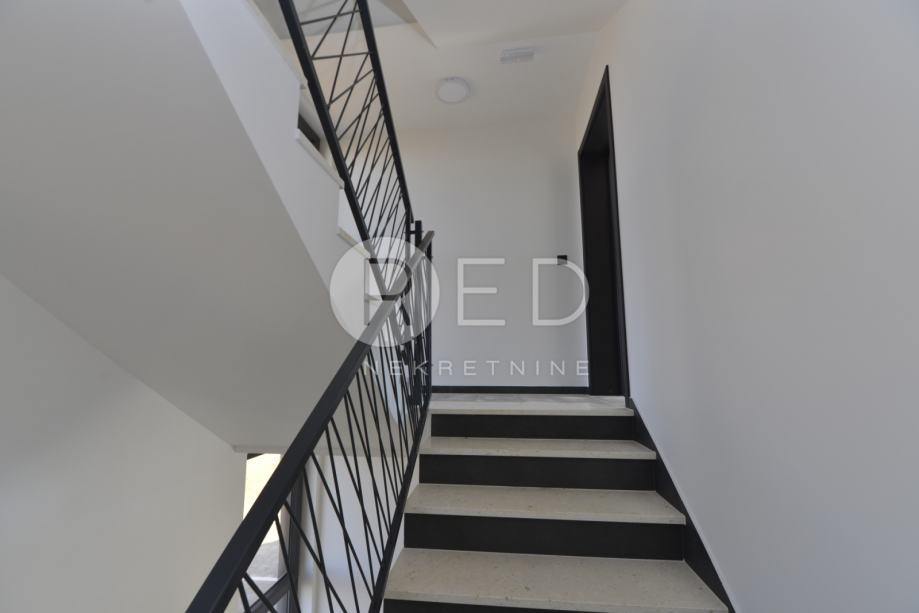 Gradnja ove odlične zgrade je izvršena ciglenim termo blokom. Fasada ima termoizolaciju od stiropora debljine 10 cm. Prozori su od PVC materijala s troslojnim staklom, električnim roletama i komarnicima. Podne obloge su visokokvalitetne pločice. Dnevni boravak i spavaće sobe su klimatizirani. U cijelom stanu je provedeno podno grijanje na struju. Ulazna vrata stana su protuprovalna i protupožarna.