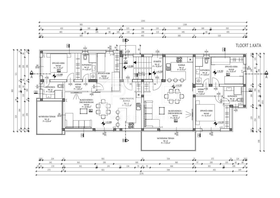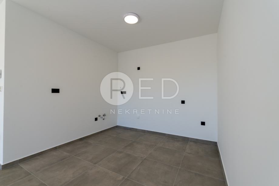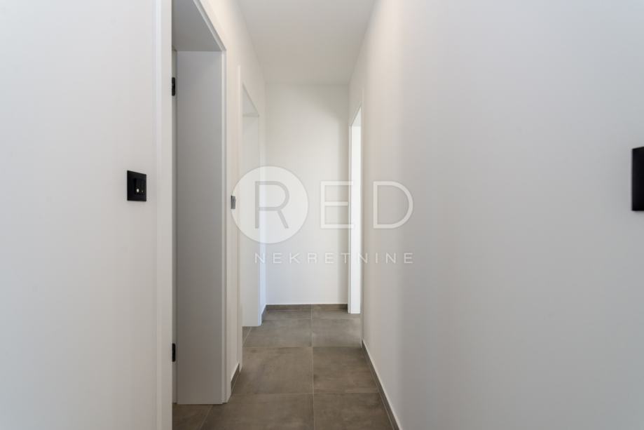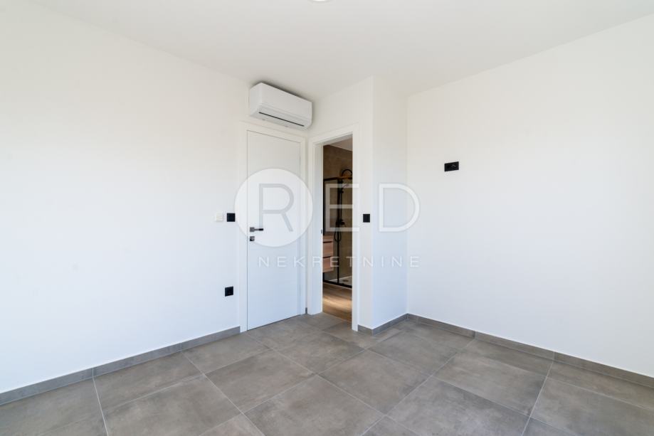 Nalazi se na 1. katu, a sastoji se od open space dnevnog boravka s kuhinjom i blagovaonicom, dvije spavaće sobe od kojih je jedna s kupaonicom, hodnika, tu je također i zasebna kupaonica, te natkrivena terasa površine 11,55 m2. Osim toga, apartmanu dodatno pripadaju i 2 parkirališna mjesta.