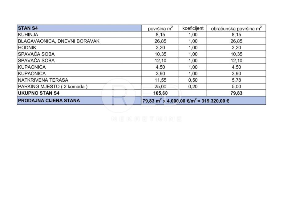 Ukupna neto korisna površina ovog apartmana sa svim pripatcima iznosi 79,83 m2.