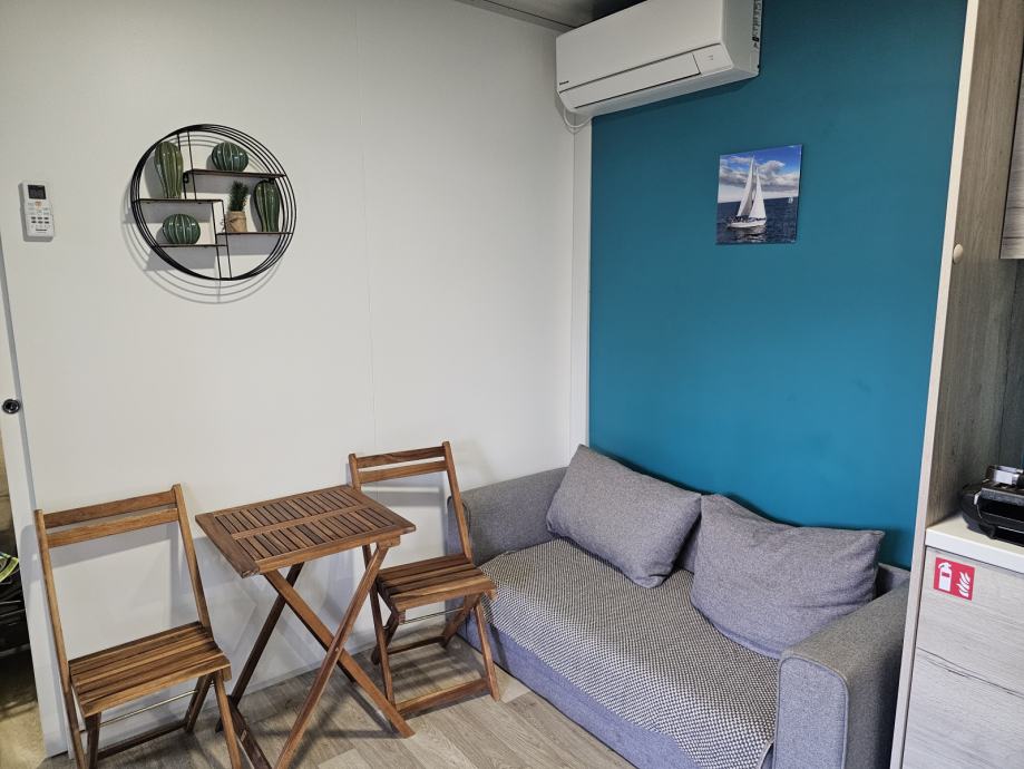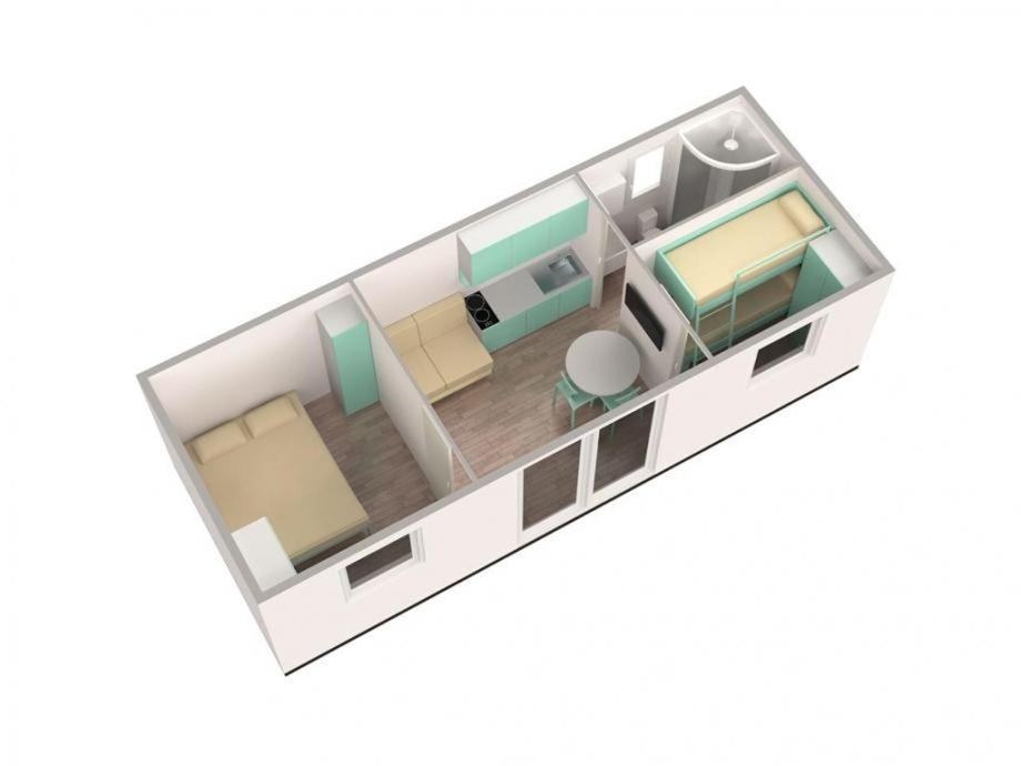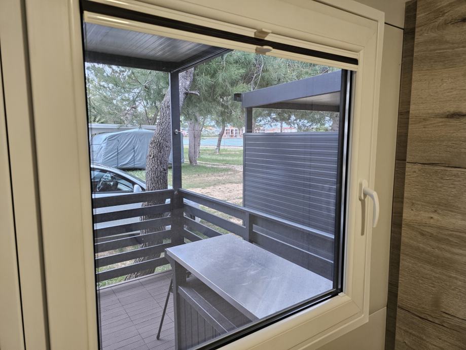 Mobilna kućica je dimenzija 8 x 3 m s natkrivenom terasom od 18 m2 i nalazi se u djelomičnoj sjeni.