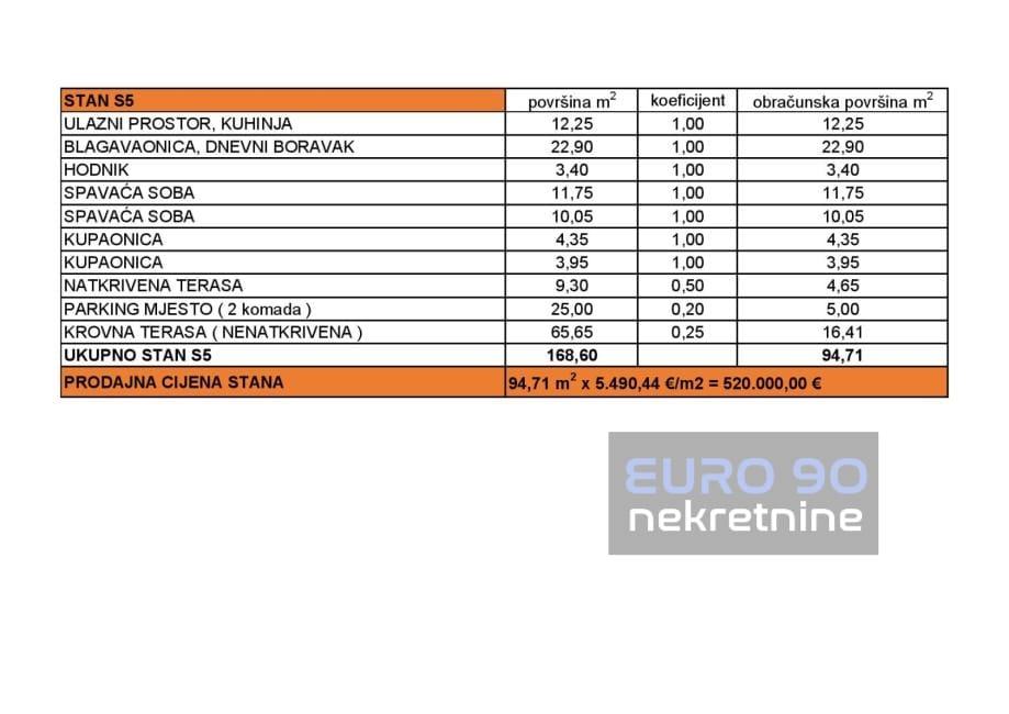 Penthouse ima 94,71 m2 sa svim pripatcima neto površine stana, te mu pripadaju dva parkirna mjesta.