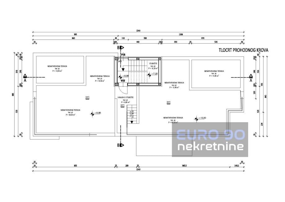Sastoji se od predsoblja, dnevnog boravka, kuhinje s blagovaonicom otvorenog koncepta ,dvije spavaće sobe , dvije kupaone s wc-om i velika krovna terasa s bazenom.