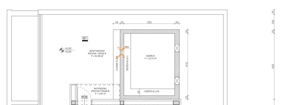 Na krovnoj terasi nalazi se bazen površine 13,74 m2, dok je 3,43 m2 obračunato u neto korisnu površinu prema koeficijentu. Neto korisna površina opisanih prostorija iznosi 88,94 m2. Apartmanu pripadaju dva parkirna mjesta, stoga ukupna neto površina s pripacima iznosi 94,14 m2.