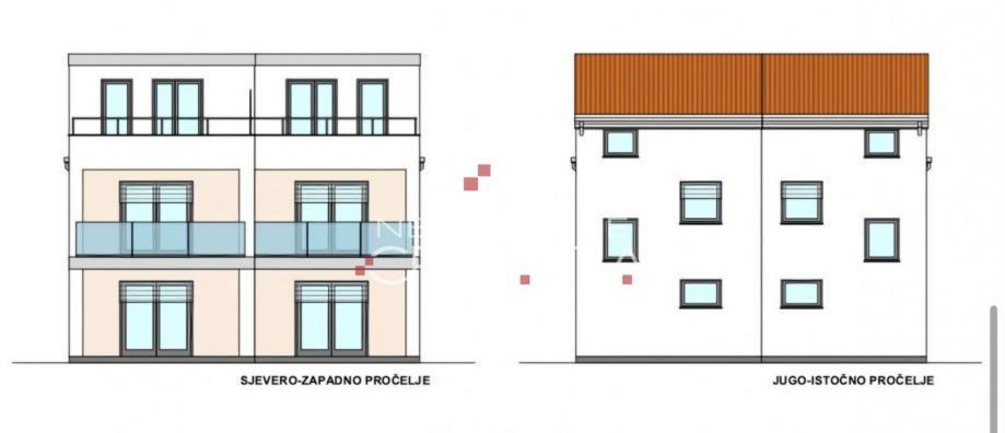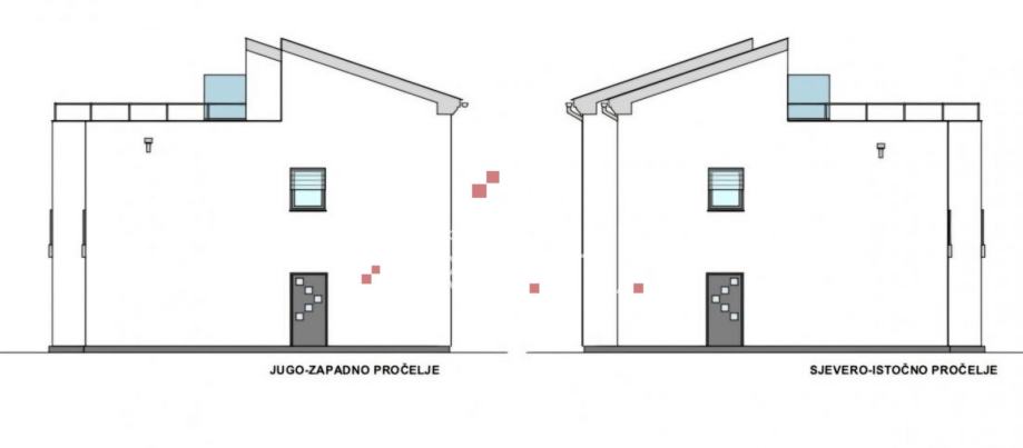 Dio kuće: prizemlje, 1. kat i potkrovlje (na tlocrtima označen crveno), ukupne neto površine 110 m². PRIZEMLJE: prostrani dnevni boravak sa blagovaonicom i kuhinjom u otvorenom prostoru, kupaonica sa WC-om, spremište, natkrivena terasa koja vodi u privatni vrt i dvorište.