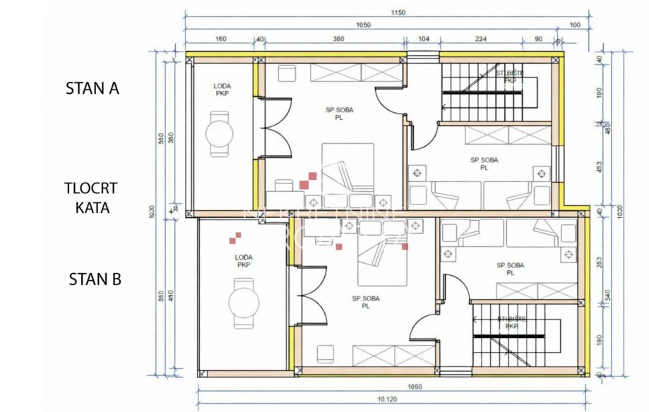 1. KAT: hodnik, spavaća soba 1, spavaća soba 2 sa lođom