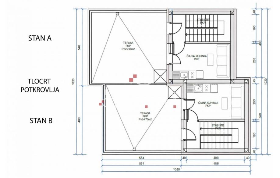POTKROVLJE: čajna kuhinja/soba (po želji) i velika terasa površine 25 m2 sa pogledom na more i Velebit.