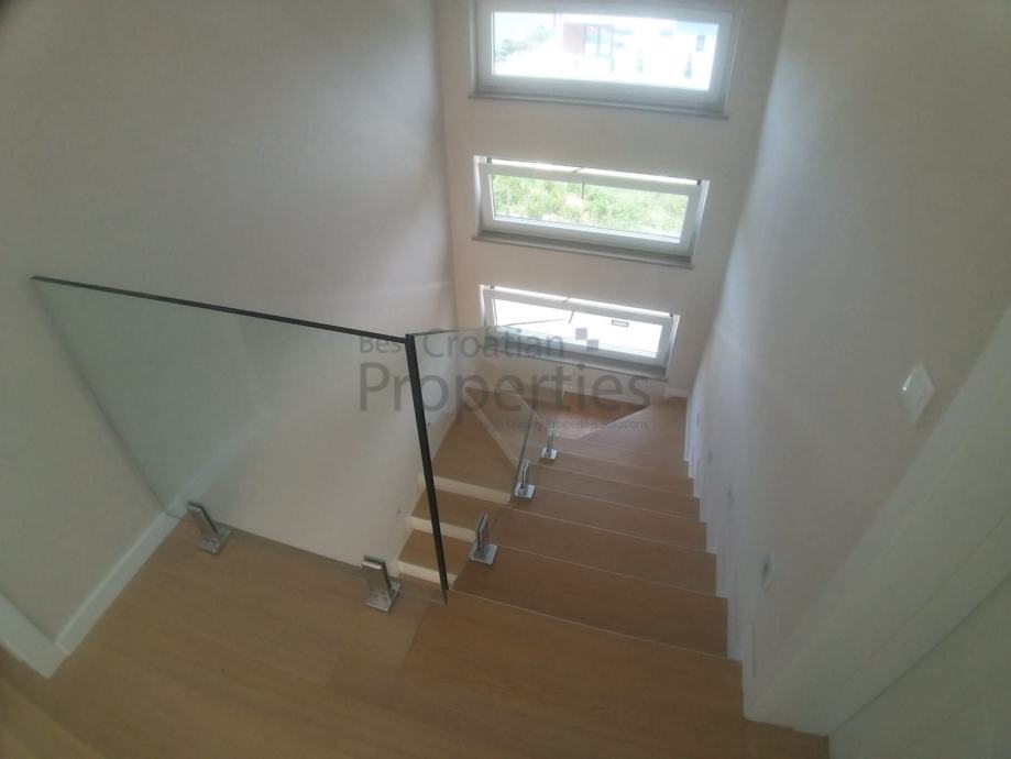 Unutarnje stepenište nas vodi na prvi kat ville gdje su smještene tri spavaće sobe od koji svaka ima svoju kupaonicu, s tim da master spavaća ima i walk-in garderobu. Dvije spavaće imaju i vlastite terase.