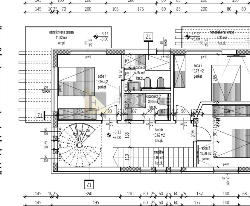 *Na katu se nalaze tri spavaće sobe, dvije kupaonice, hodnik i dvije nenatkrivene terase.