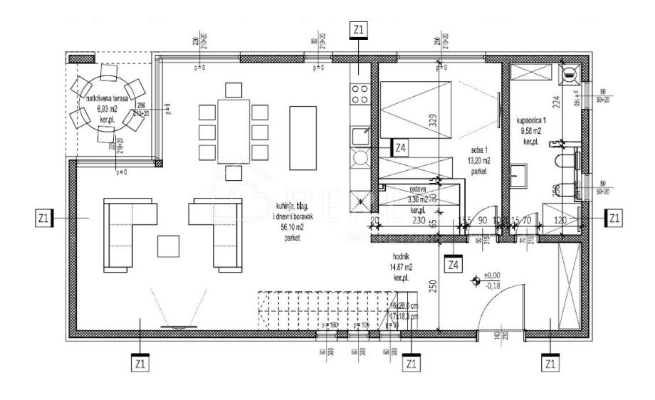 - Kuhinja, blagovaona i dnevni boravak (56,10 m2)