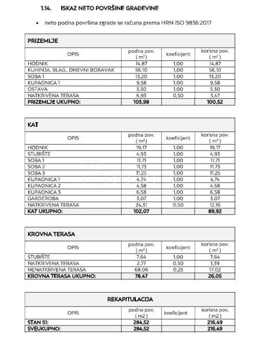 Ukupna bruto površina kuće je 284,52 m2, dok je neto korisna površina 216,49 m2.