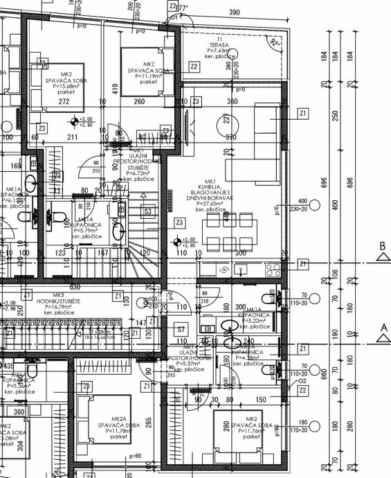 Stan S-07 – 1. kat – stambena površina 66,06 m2 (2 spavaće sobe + 2 kupaonice) + lodja (7,44 x 0,75 = 5,58 m2) + vanjsko parking mjesto PM7 (12,50 x 0,2 = 2,5 m2); neto obračunske površine 74,14 m2 = 398.502 EUR