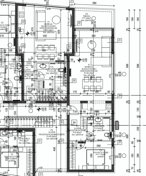 Stan S-04 – prizemlje – stambena površina 54,83 m2 (1 spavaća soba + 1 kupaonica) + lodja (7,44 x 0,75 = 5,58 m2) + terasa (10,82 m2 x 0,2 = 2,16 m2) + vrt (37,32 m2 x 0,1 = 3,73 m2) + vanjsko parking mjesto PM4 (12,50 x 0,2 = 2,5 m2); neto obračunske površine 68,80 m2 = 369.800 EUR