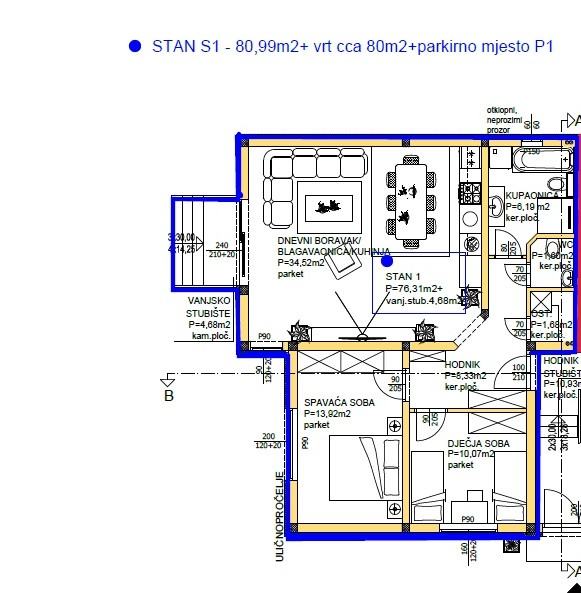 Na prodaju je trosobni stan oznake S1 koji se nalazi u prizemlju stambene zgrade čiji je završetak gradnje planiran u travnju 2024.godine. Stambena zgrada se sastoji od pet stambenih jedinica koje su projektirane kako bi zadovoljile visoke standarde života. Na svakom katu zgrade se nalaze dvije stambene jedinice. Vrhunska kvaliteta zgradnje i opreme vidljiva je od samog početka gradnje. Vanjski izgled zgrade čini moderna arhitektura s velikim staklenim stijenama - PVC stolarija antracit boje, toplinska izolacija (10 cm stiropor), niskotemperaturni sustav podnog grijanja (dizalice topline) u svim stanovima, "walk - in" tuševi s kanalicom u razini poda, staklene kabine, sanitarije visoke klase, keramika i višeslojni parketi I klase.