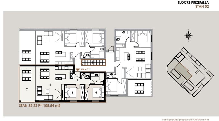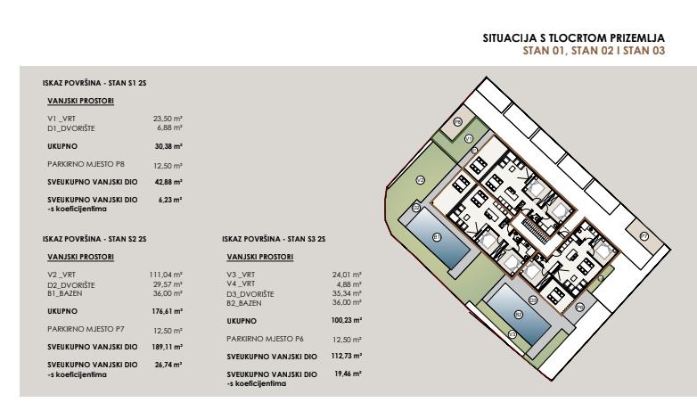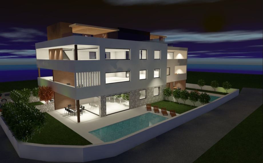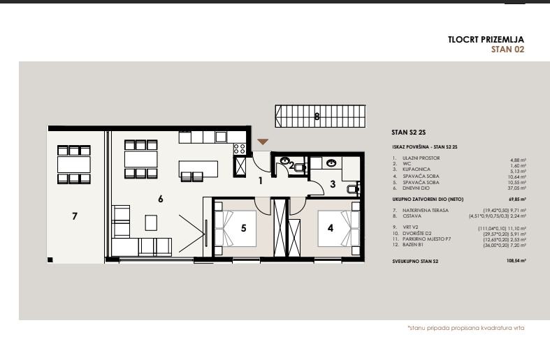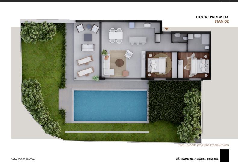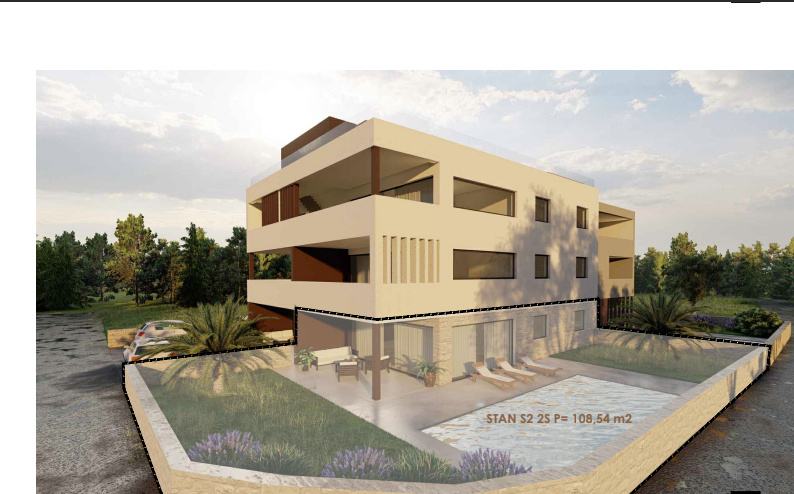 NOVOGRADNJA – Stan S2 u prizemlju zgrade s vrtom i bazenom, samo 60 m od pješčane plaže . Prodaje se stan u prizemlju novogradnje sa 8 stanova, smještenoj u mirnom dijelu Privlake. Zgrada je u gradnji, a useljenje se planira u svibnju 2026. Stan oznake S2 se sastoji od ulaznog prostora, kuhinje s blagavaonom i dnevnim boravkom, dvije spavaće sobe, kupaone i wc-a, ukupno 69,85 m2 stambeno, plus natkrivena terasa 19,42 m2 po koef 0,5 9,71 m2), ostava 4,5 m2 vrt od 111,04 m2, dvorište 29,57 m2, bazen površine 36 m2 i jedno parkirno mjesto. Ukupno stan oznake S2 sa pripatcima ima 108,54 m2. • Vrhunska unutarnja stolarija • PVC stolarija s ALU roletama na elektro pogon, troslojno staklo s Low-e premazom, komarnici • Podovi: parket i keramika I. klase Dodatne pogodnosti: • Visok energetski standard (A razred) • Kupac ne plaća porez na promet nekretnina • Cijena: 545 000 EUR . U cijenu je uključen namještaj. U zgradi su na prodaju sljedeći stanovi: S1 - prizemlje, dvosoban stan sa vrtom 85,35 m² – 345.000,00 € S2 - prizemlje, dvosoban stan sa vrtom i bazenom 108,55 m² , kompletno namješten 545 000 eura. S3 – prizemlje, dvosoban stan sa vrtom i bazenom 97,87 m² - kompletno namješten 490.000 € . S4 - 1. kat, dvosoban stan 80,75 m² – 325.000,00 € S5 - 1. kat, dvosoban stan 80,70 m² – 365.000,00 € S6 – 1. kat, dvosoban stan 80,72 m² – 340.000,00 € S7 – 2. kat trosoban stan sa krovnom terasom 158,33 m² – 760.000,00 € (namješten). S8 - 2. kat, trosoban stan sa krovnom terasom 157,69 m² – 720.000,00 € (namješten). Četiri stana će biti kompletno namještena stanovi S2 i S3 u prizemlju i stanovi S7 i S8 na 2 katu . U cijenu je uključen namještaj, ostali se prodaju nenamješteni. Zgrada je u gradnji te se planira završetak do sezone 2026. godine.