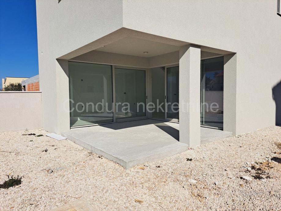 Velike staklene stijene iz kuhinje i blagovaonice vode na prostranu natkrivenu terasu površine 16 m2 koja se nastavlja na dvorište s bazenom i vrtom.