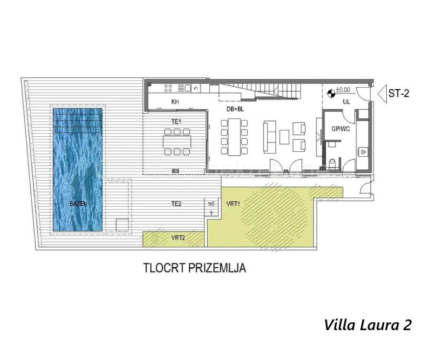 Villa 'Laura 1' neto površine 267,14 m2 ima gotovo identičan raspored prostorija, dvorište ukupne površine 77,92 m2 s grijanim bazenom te joj također pripadaju 2 parkirna mjesta.