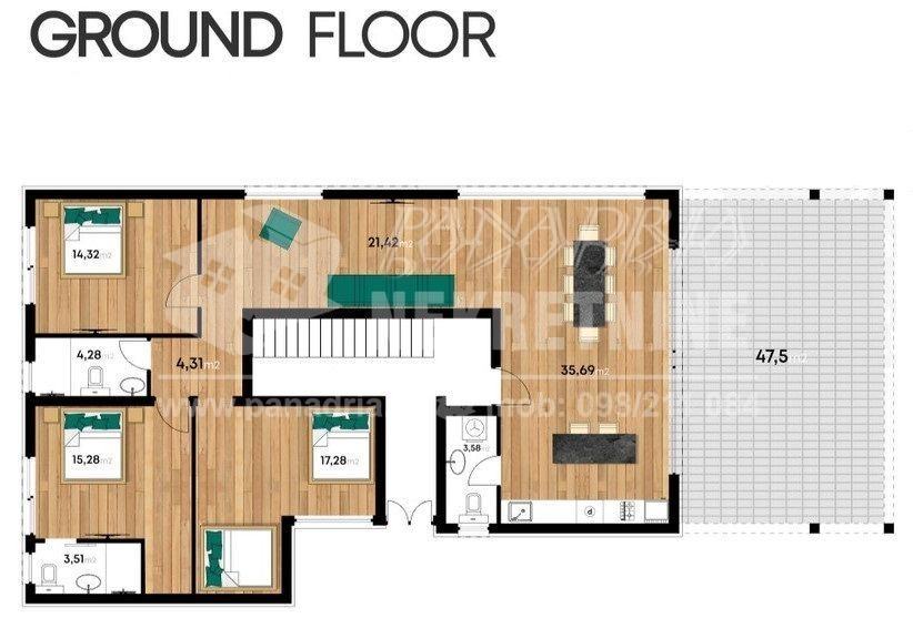 Iz kuhinje s blagovaonicom izlazi se na natkrivenu terasu površine 47,50 m2. Obje spavaće sobe imaju izlaz se na nenatkriveni dio terase u nastavku koje se nalazi dio vrta.