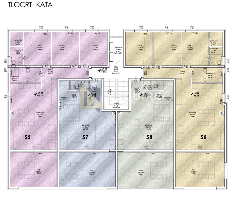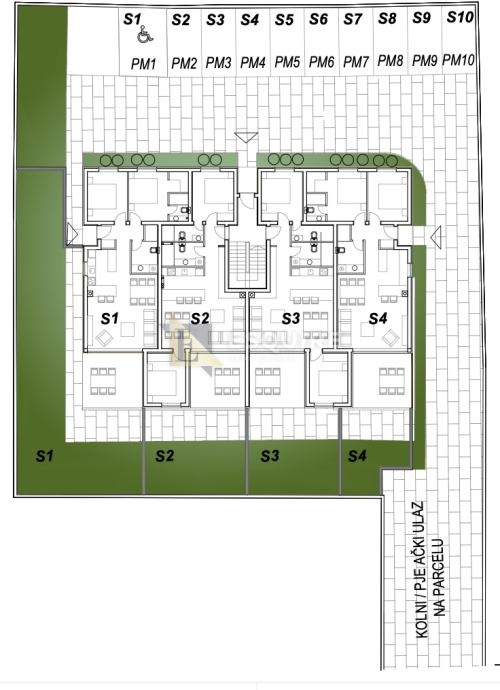 - Prizemlje: 4 dvosobna stana, svaki s pripadajućim vrtom i parkirnim mjestom