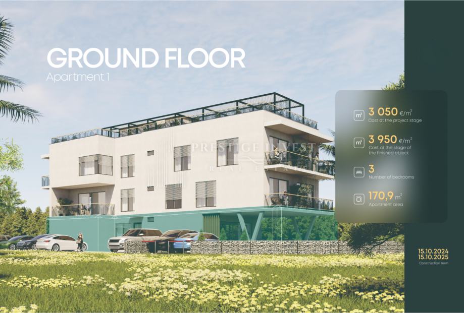 Stan ima 3 spavaće sobe i 3 kupaonice s prostranim dnevnim boravkom i kuhinjom od 57,11m2 i vanjskom terasom od 47,5m2.