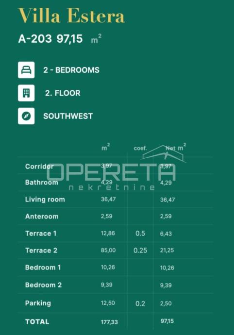 Stan E203 nalazi se na 2. katu, a sastoji se od: hodnika, predsoblja, kupaonice, dnevnog boravka sa kuhinjom i blagavaonicom u open space konceptu, terase 1, terase 2, 2 prostrane spavaće sobe i parkinga.